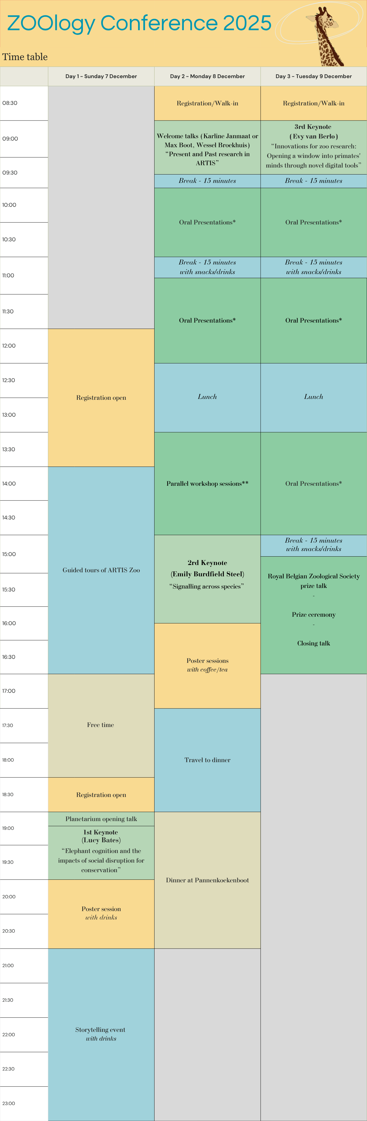The conference will start on the afternoon of Sunday December 7th, giving attendees the time to register and the opportunity to visit ARTIS Amsterdam Royal Zoo for free. For those interested in the zoo, its animals and plants and its rich history, there will be (optional) guided tours on the first day of the conference. In the evening, the conference will be kicked off under the starry skies of the ARTIS Planetarium by our first keynote speaker, Dr. Lucy Bates, who will give a talk about elephant cognition and the impacts of social disruption for elephant conservation. We will end the evening with the first poster presentation session (with drinks) and a story telling evening